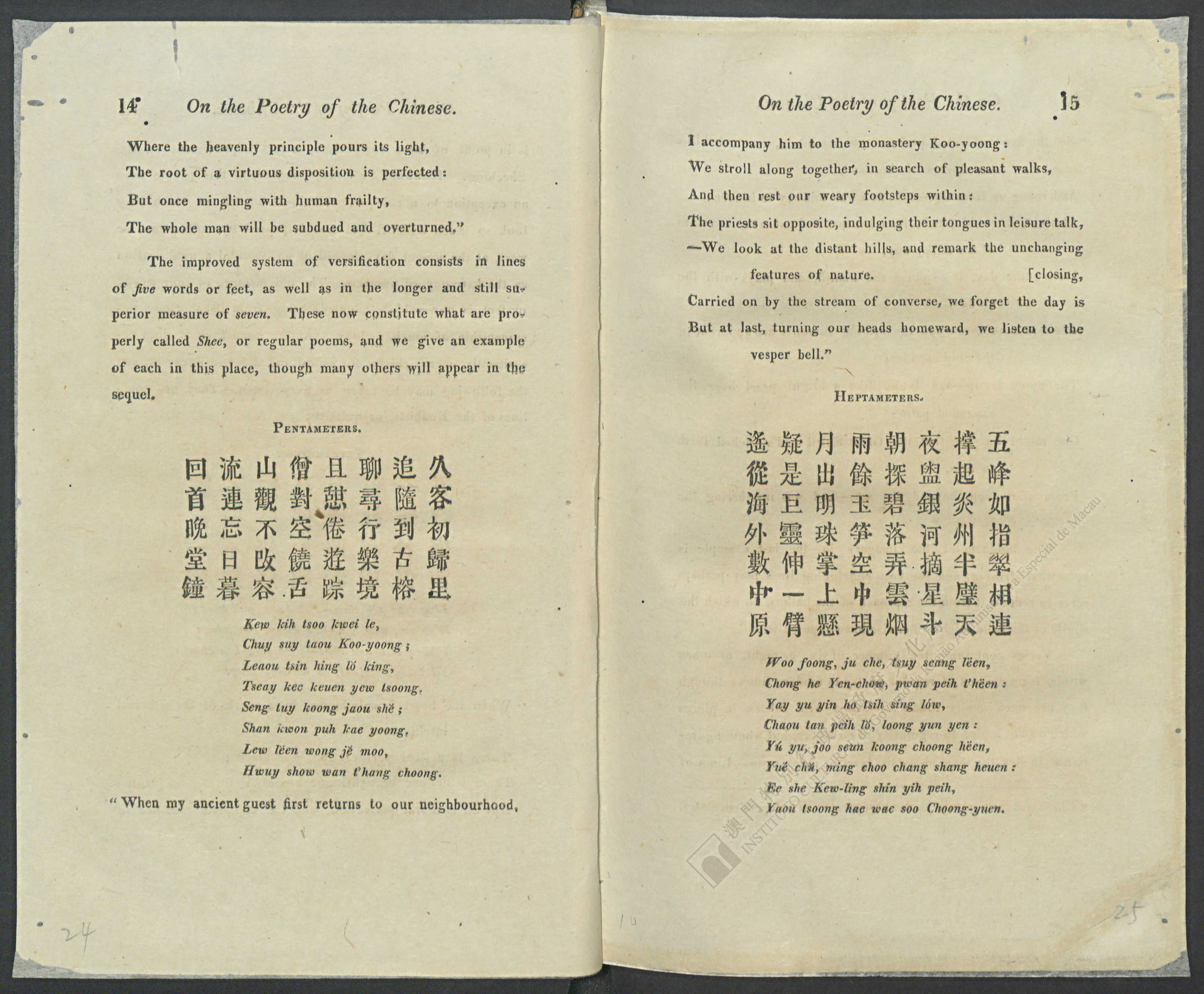 - On the Poetry of the Chinese: from the Royal Asiatic Transactions (1834), compiled by sinologist and the second Governor of Hong Kong, Sir John Francis Davis, introduces Chinese poetry and includes English translations of selected passages from Records of the Three Kingdoms, reflecting early Western understanding and interpretation of Chinese literature.