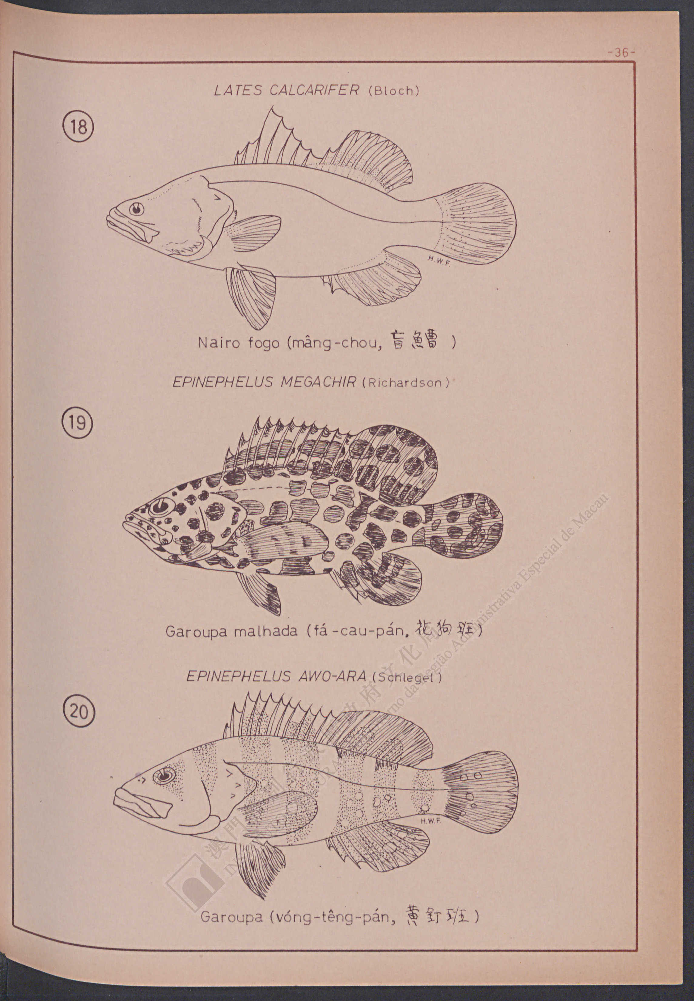 - Catálogo de Peixes Comestíveis de Macau (Catalogue of Edible Fish of Macao) (1959), compiled by José da Silva Vidigal, is a richly illustrated work that introduces 52 edible fish species found in Macao during the 1950s, listing their scientific names, body lengths, and fishing seasons, along with their Chinese names and detailed illustrations.