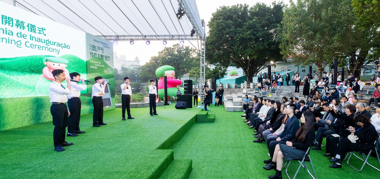 A cerimónia de inauguração foi presidida pela Presidente do IC, Leong Wai Man; pela Subdirectora do Departamento de Publicidade e Cultura do Gabinete de Ligação do Governo Popular Central na Região Administrativa Especial de Macau, Bai Bing; pela Presidente do Conselho de Administração do Centro de Ciência de Macau, S.A., Mok Ian Ian; pela Subdirectora da Direcção dos Serviços de Assuntos de Subsistência da Zona de Cooperação Aprofundada entre Guangdong e Macau, em Hengqin, Sou Hoi Chi; pela Chefe do Departamento de Promoção Turística da Direcção dos Serviços de Turismo, Lau Fong Chi; pela Chefe, Substituta do Departamento dos Assuntos Culturais e Recreativos e de Educação Cívica do Instituto para os Assuntos Municipais, Pong Sio Wan; pela Chefe da Divisão de Ensino Primário e de Ensino Infantil da Direcção dos Serviços de Educação e de Desenvolvimento da Juventude, Ka Si In; pela Presidente da Federação de Juventude de Macau, Wong Kit Cheng; pela Vice-Presidente da Assembleia Geral da Associação Geral de Estudantes Chong Wa de Macau, Chu Ieng Tong; pelo Vice-Presidente da Associação de Nova Juventude Chinesa de Macau, Wan Weng I; e pelo Director-Geral Adjunto do Macau Youth Development Service Centre, Cheong Ka Man. Estiveram ainda presentes na cerimónia a Subdirectora da Biblioteca de Shenzhen, Wang Yan; o Director da Biblioteca Sun Yat-Sen da Província de Guangdong, Chen Jianhui; assim como representantes de vários serviços do Governo, bibliotecas de Macau e associações civis.