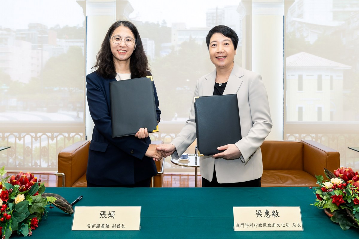 澳门特别行政区政府文化局与首都图书馆于10月24日在澳门文化局大楼签署《首都图书馆与澳门特别行政区政府文化局合作协议》,由文化局局长梁惠敏与首都图书馆副馆长张娟代表双方签署,标志着两地在公共图书馆领域的交流与合作迈入新阶段。