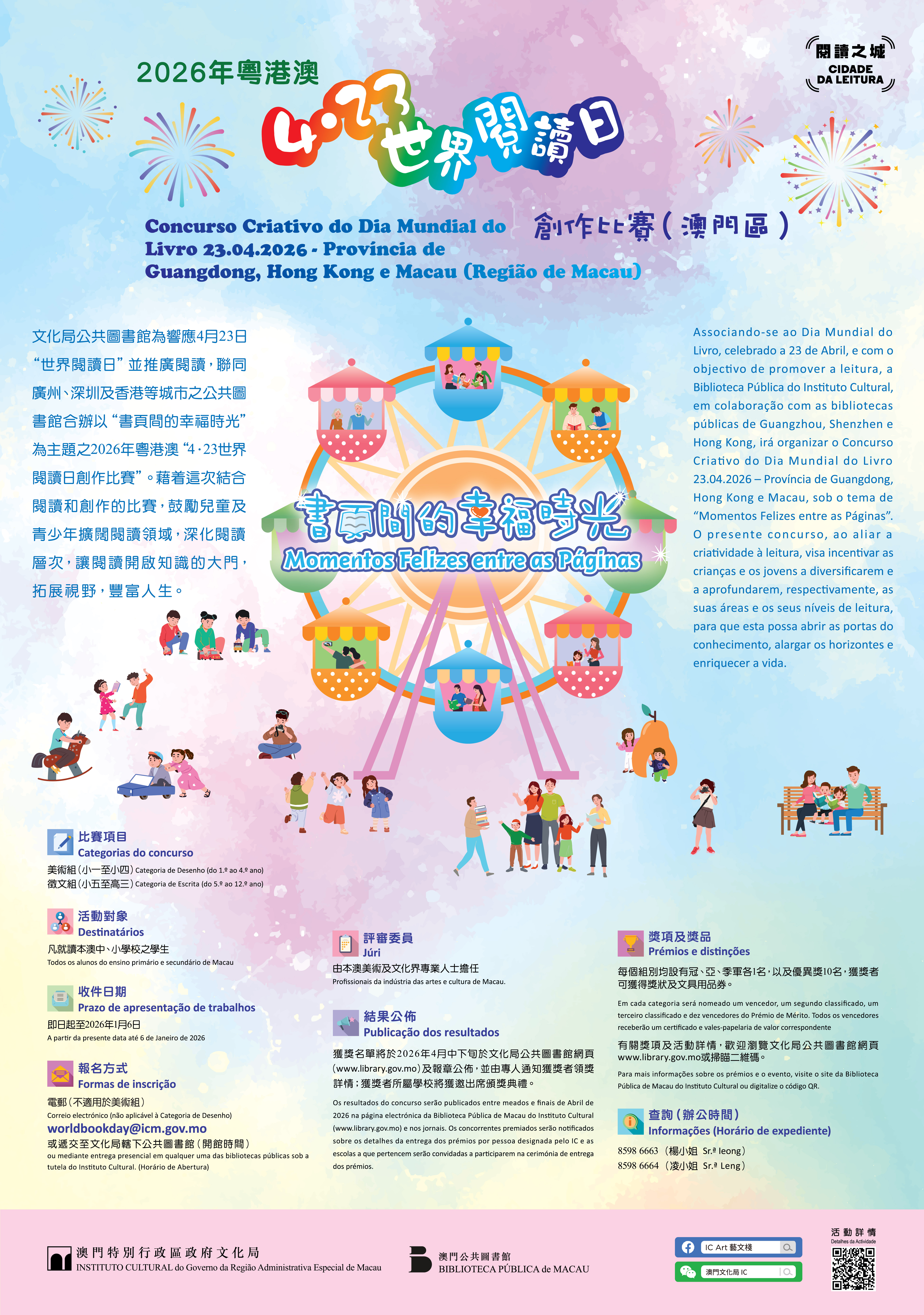 为响应每年4月23日“世界阅读日”,文化局公共图书馆联同广州、深圳及香港等城市的公共图书馆联合举办2026年粤港澳“4‧23世界阅读日创作比赛”,主题为“书页间的幸福时光”,藉阅读和创作相结合,鼓励儿童及青少年扩阔阅读领域,深化阅读层次,让阅读开启知识的大门,拓展视野,丰富人生。澳门区比赛的收件期为即日起至2026年1月6日。