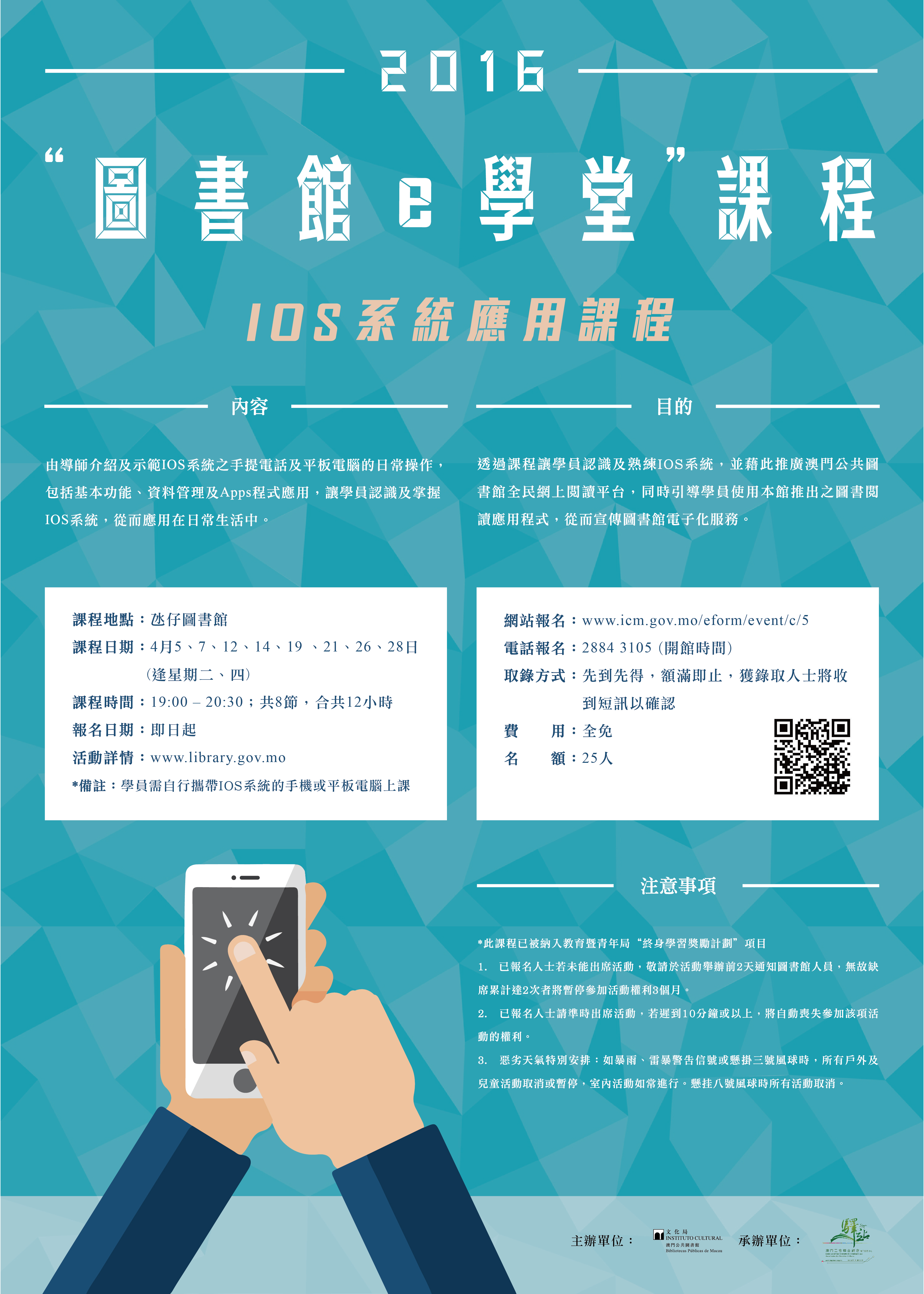 目的:透过课程让学员认识及熟练IOS系统,并藉此推广澳门公共图书馆全民网上阅读平台,同时引导学员使用本馆推出之图书阅读应用程式,从而宣传图书馆电子化服务。