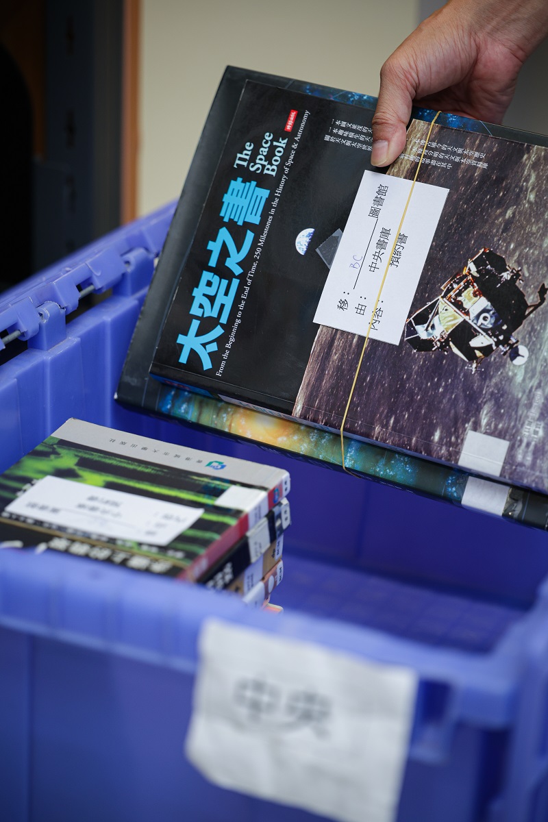 點收圖書: 館員會先檢查書籍是否完整無缺,並核對圖書項目與數量等資料無誤,確認後再貼上條碼標籤。