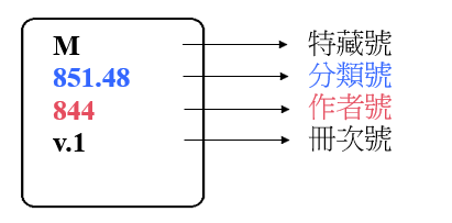 索書號由特藏號、分類號、作者號、冊次號所組成。