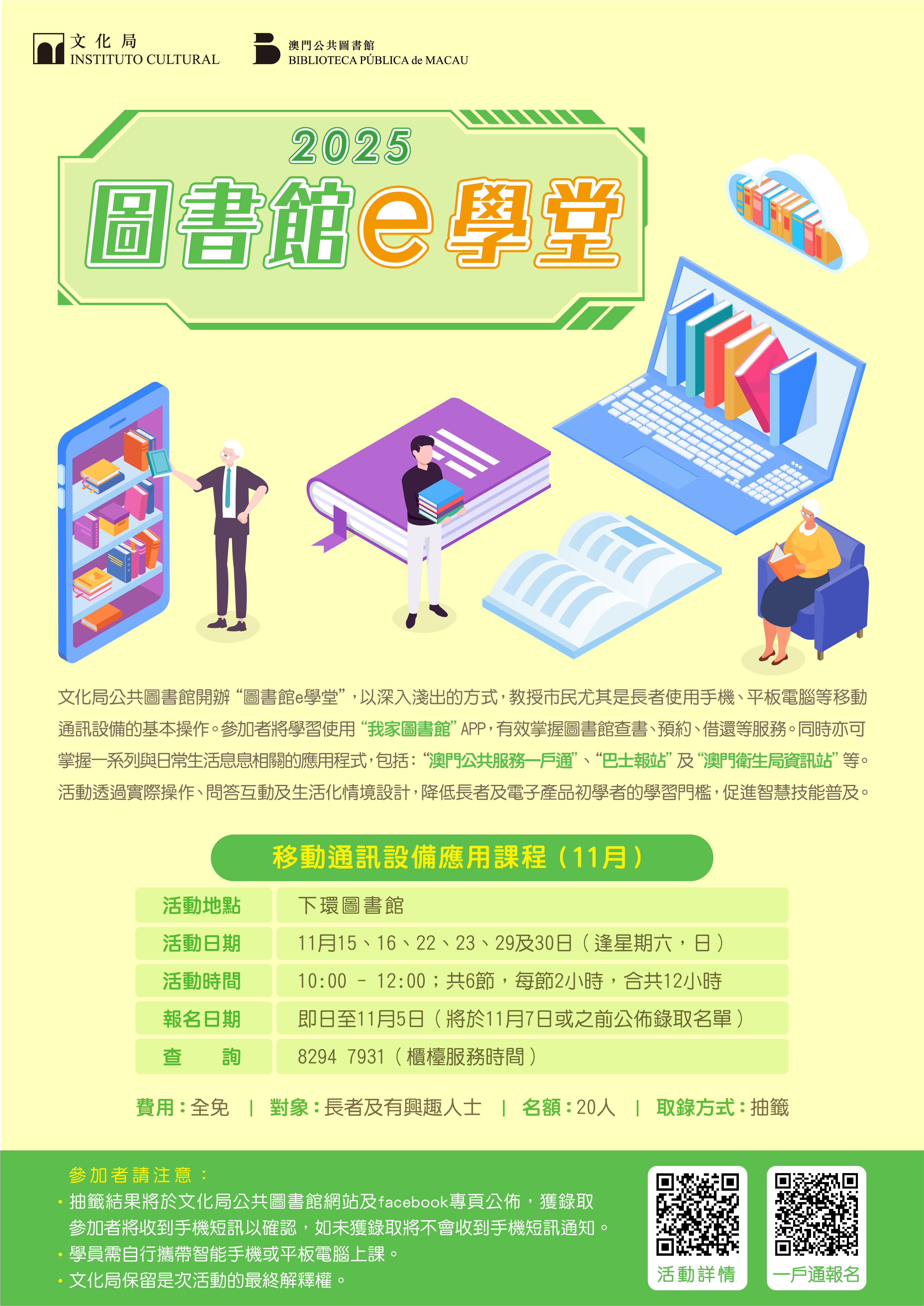 為推動智慧社會建設,文化局公共圖書館開辦“圖書館e學堂”,以深入淺出的方式,教授市民尤其是長者使用手機、平板電腦等移動通訊設備的基本操作。活動不僅涵蓋裝置設定與日常應用,更著重於提升市民對電子政務及公共服務的熟悉程度。透過學堂內容,參加者將學習使用“我家圖書館”APP,有效掌握圖書館查書、預約、借還等服務。同時亦可掌握一系列與日常生活息息相關的應用程式,包括:“澳門公共服務一戶通”、“巴士報站” 及“澳門衛生局資訊站”等。活動透過實際操作、問答互動及生活化情境設計,降低長者及電子產品初學者的學習門檻,促進智慧技能普及。讓市民輕鬆掌握使用公共電子服務的能力,也進一步拉近市民與社會資源的距離,推動數字平權、代際共融。