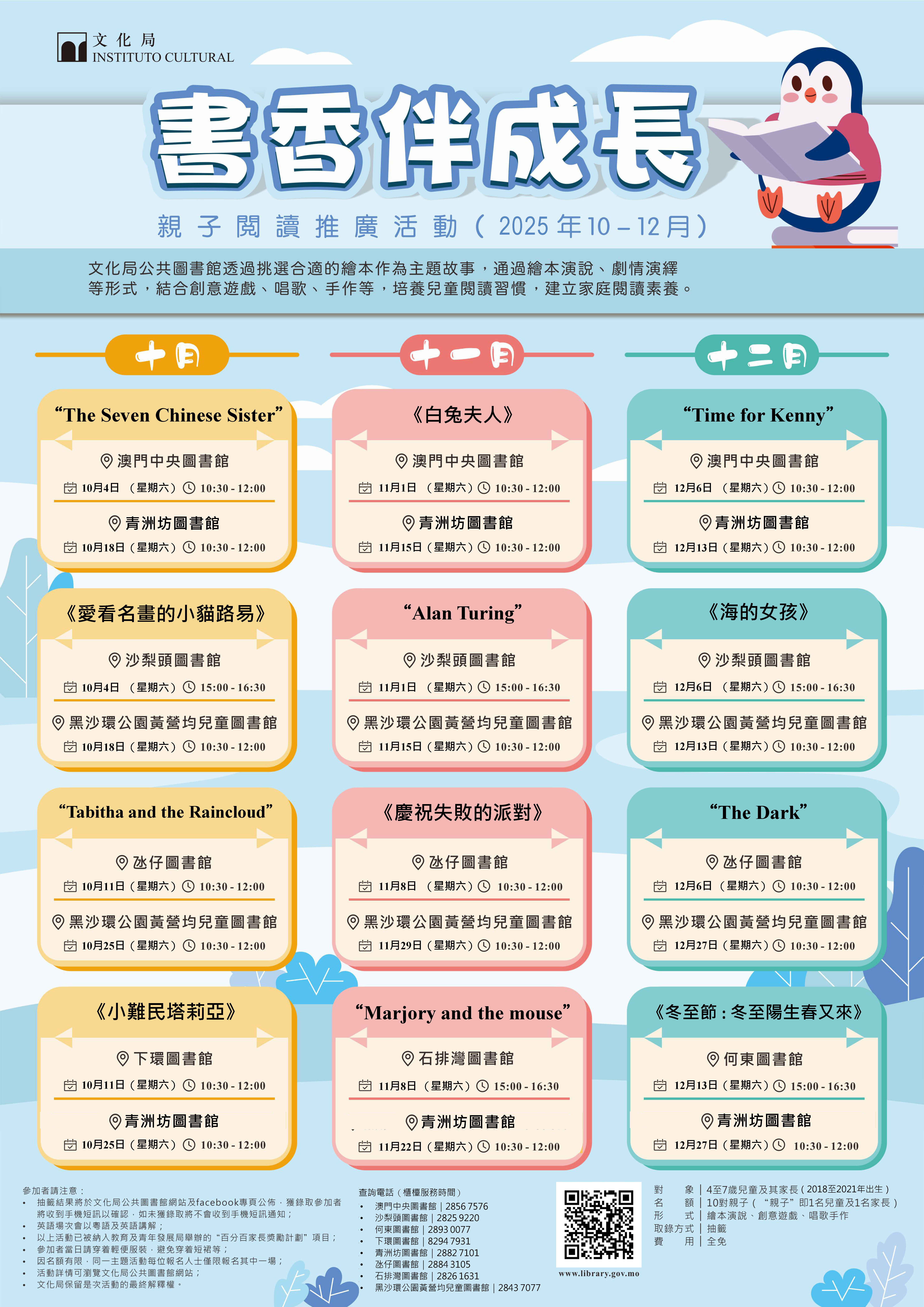 地 點:澳門中央圖書館/沙梨頭圖書館/何東圖書館/下環圖書館/氹仔圖書館/石排灣圖書館/青州坊圖書館/黑沙環公園黃營均兒童圖書館