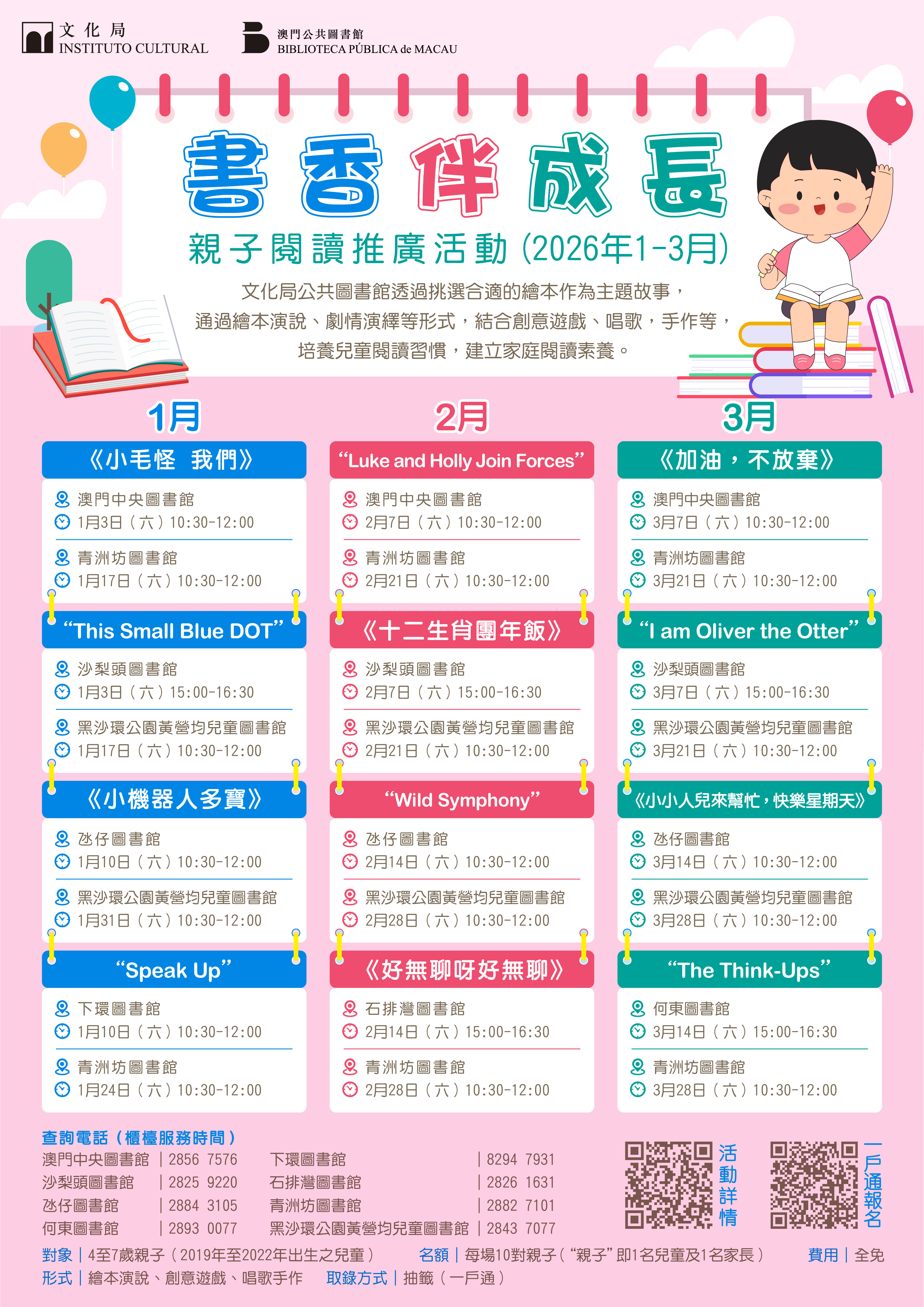 地 點:澳門中央圖書館/沙梨頭圖書館/何東圖書館/下環圖書館/氹仔圖書館/石排灣圖書館/青州坊圖書館/黑沙環公園黃營均兒童圖書館