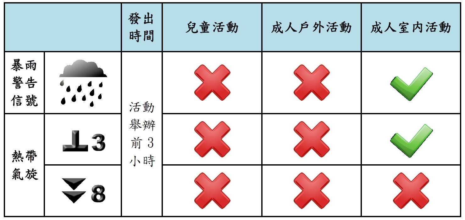 3.需報名之活動在惡劣天氣下的特別安排:活動舉辦前3小時,如遇暴雨或懸掛三號風球時,所有兒童活動及成人戶外活動取消或延期,成人室内活動如常進行。如懸掛八號風球時,所有活動取消。