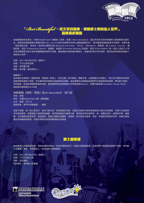 由英國著名作家傑夫‧代爾 (Geoff Dyer) 撰寫的《然而,很美》(But beautiful),是近年來不可多得有關爵士樂的優秀文學作品,就連向來挑剔的爵士鋼琴大師Keith Jarrett與日本著名作家村上春樹皆稱讚不已,是次活動將跟隨該書文字脈絡,沿著作者 “疑似傳記小說” 的手法,探索從艾靈頓公爵 (Edward Kennedy “Duke” Ellington)、賴斯特‧楊 (Lester Young) 、塞隆尼斯.孟克 (Thelonious Monk)、查爾斯‧明格斯 (Charles Mingus) 到查特‧貝克 (Chet Baker) 等一眾於上世紀六十年代前活躍的偉大爵士樂手的精神面貌與時代氛圍,講座過程中將加插珍貴圖片、錄音與影像片段作參照,務求引領參加者走進爵士樂的迷人世界。