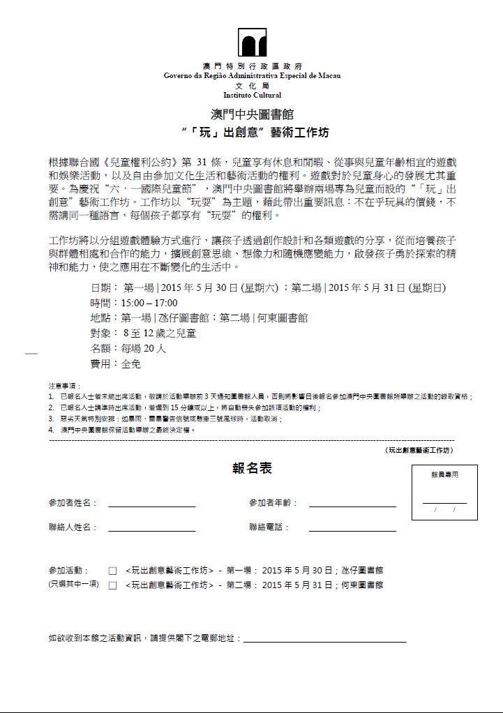 根據聯合國《兒童權利公約》第31條,兒童享有休息和閒暇、從事與兒童年齡相宜的遊戲和娛樂活動,以及自由參加文化生活和藝術活動的權利。遊戲對於兒童身心的發展尤其重要。為慶祝“六 · 一國際兒童節”,澳門中央圖書館將舉辦兩場專為兒童而設的“「玩」出創意”藝術工作坊。工作坊以“玩耍”為主題,藉此帶出重要訊息:不在乎玩具的價錢,不需講同一種語言,每個孩子都享有“玩耍”的權利。