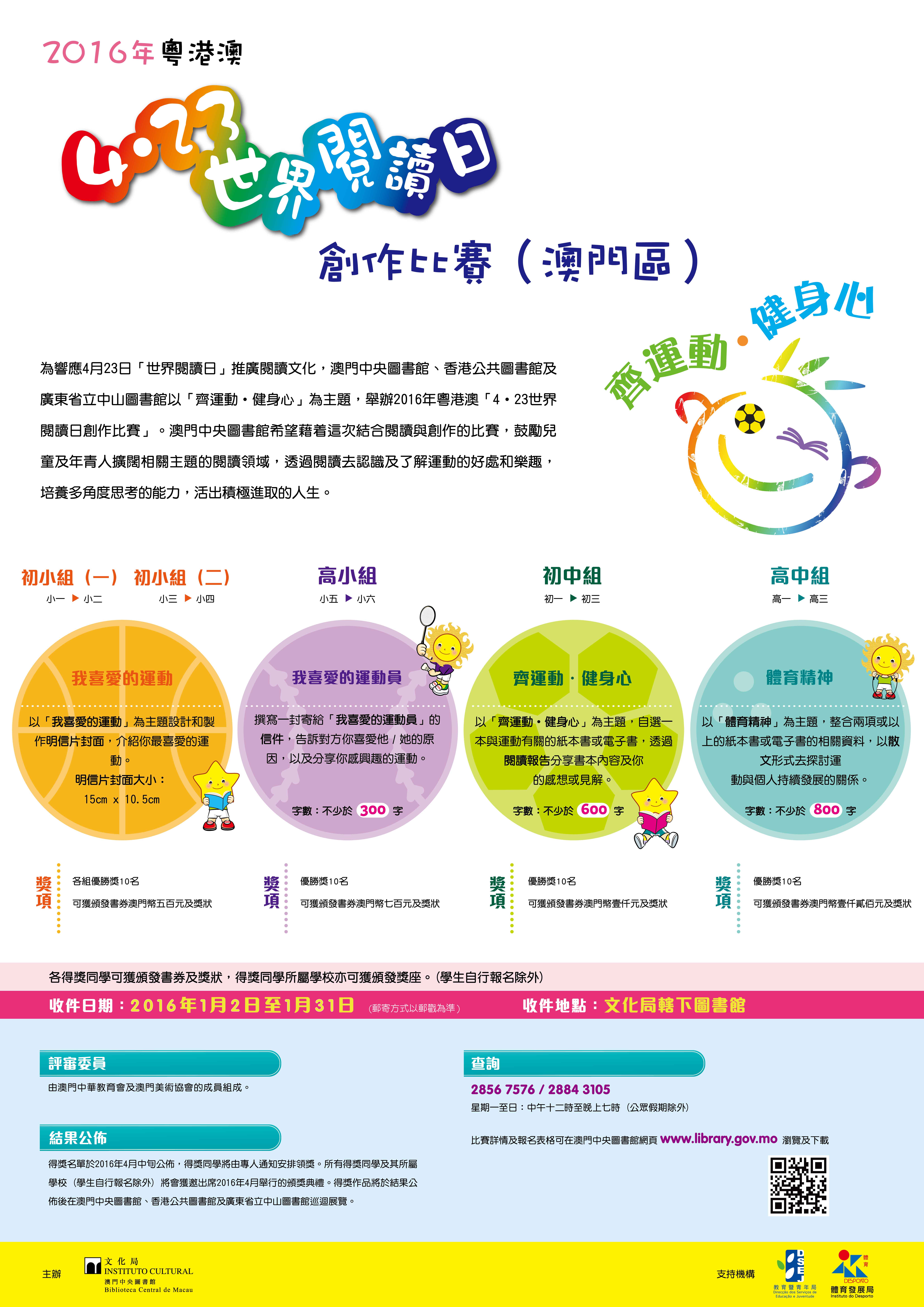 為響應4月23日「世界閱讀日」推廣閱讀文化,澳門中央圖書館、香港公共圖書館及廣東省立中山圖書館以「齊運動‧健身心」為主題,舉辦2016年粵港澳「4‧23世界閱讀日創作比賽」。澳門中央圖書館希望藉着這次結合閱讀與創作的比賽,鼓勵兒童及年青人擴闊相關主題的閱讀領域,透過閱讀去認識及了解運動的好處和樂趣,培養多角度思考的能力,活出積極進取的人生。