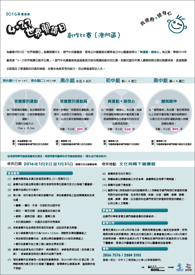 由文化局澳門公共圖書館、香港公共圖書館、廣東省立中山圖書館、深圳圖書館共同舉辦的 二零一六年“粵港澳4.23世界閱讀日創作比賽”已圓滿結束。是次寫作及明信片設計比賽以“齊運動‧健身心”為主題,藉結合閱讀與創作的比賽,鼓勵兒童及年青人擴闊相關主題的閱讀領域,透過閱讀認識及瞭解運動的好處和樂趣,培養多角度思考的能力。澳門地區共收到一千零九十二份作品。